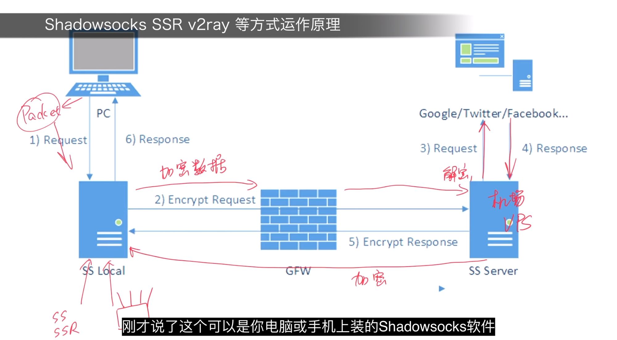 VPN服务器解密:得到本地PC用密钥加密过的数据包进行解密后发送给数据包请求的服务器,得到信息后再进行加密经由GFW返回本地PC