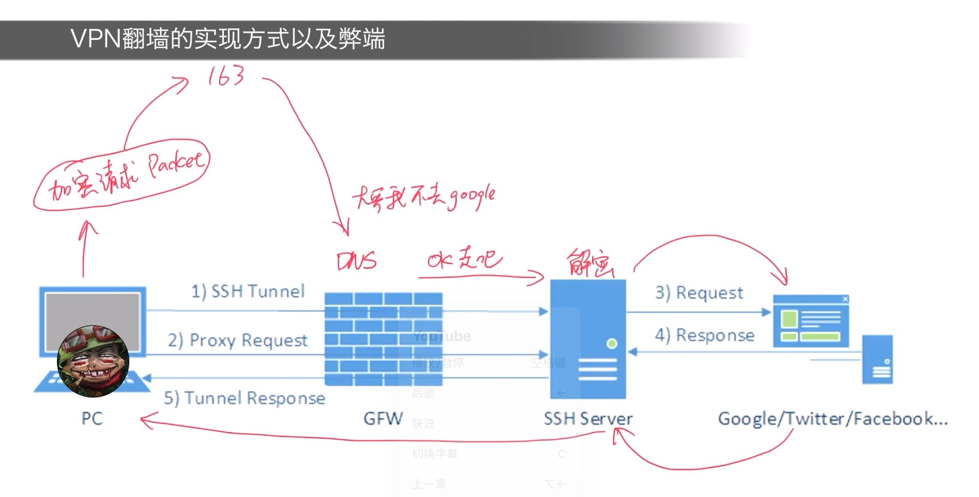 绕过墙,无非就是让墙不知道我们想访问哪个目标服务器来让墙给我们的请求包放行,市面上主要有VPN和代理两种翻墙方式,内容参考自油管博主“电丸科技AK”